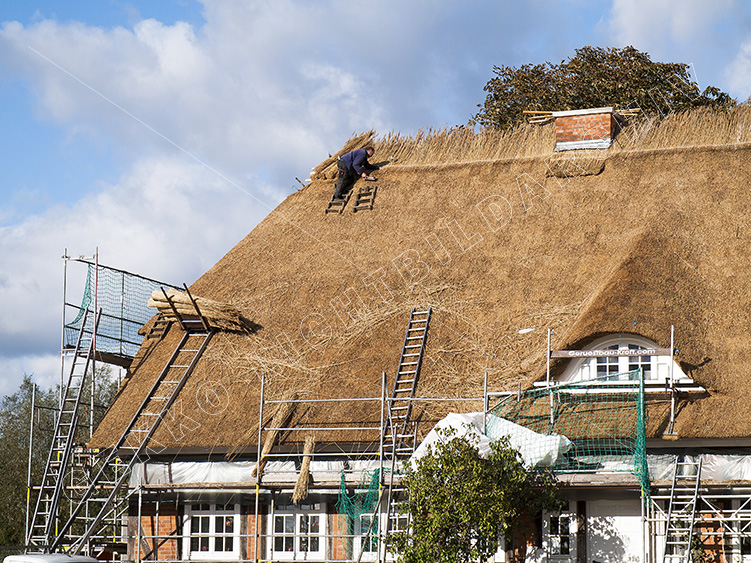 Thatcher at work restoring the thatched roof of an old farmhouse in Bütlingen, Niedersachsen, Germany.