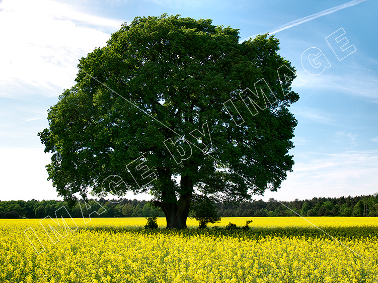 Oak tree in a rapeseed field in Niedersachsen, Germany,