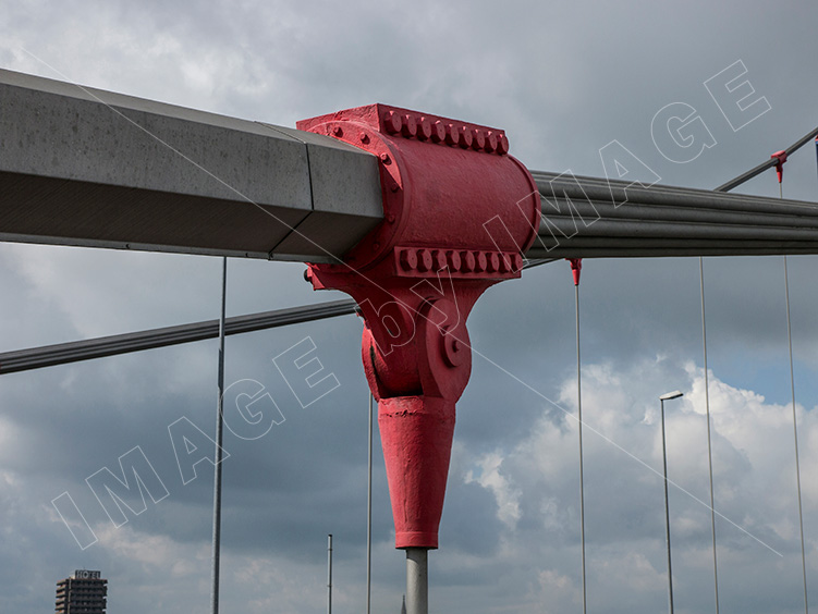 Rope-clamp on the Rhine bridge Friedrich-Ebert-Bruecke, Duisburg, Germany.
